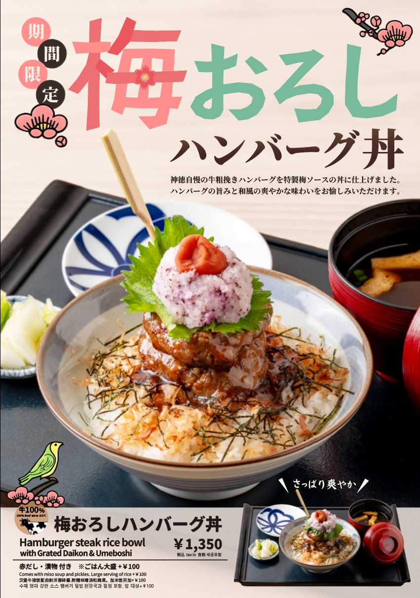 毎朝「挽きたての肉」を使い炭火で「焼き締め」して、肉本来の旨味を閉じ込めた挽肉屋神徳のハンバーグ 其々の肉の旨味を最大限引き出した黄金比率の挽肉は、挽きの粗さ、捏ね方、スパイスの調合、焼き方まで 全工程においてとことんこだわりました 「和」をテーマにした洗練されながらも温かみのある空間で、焼きたてのハンバーグをお楽しみください